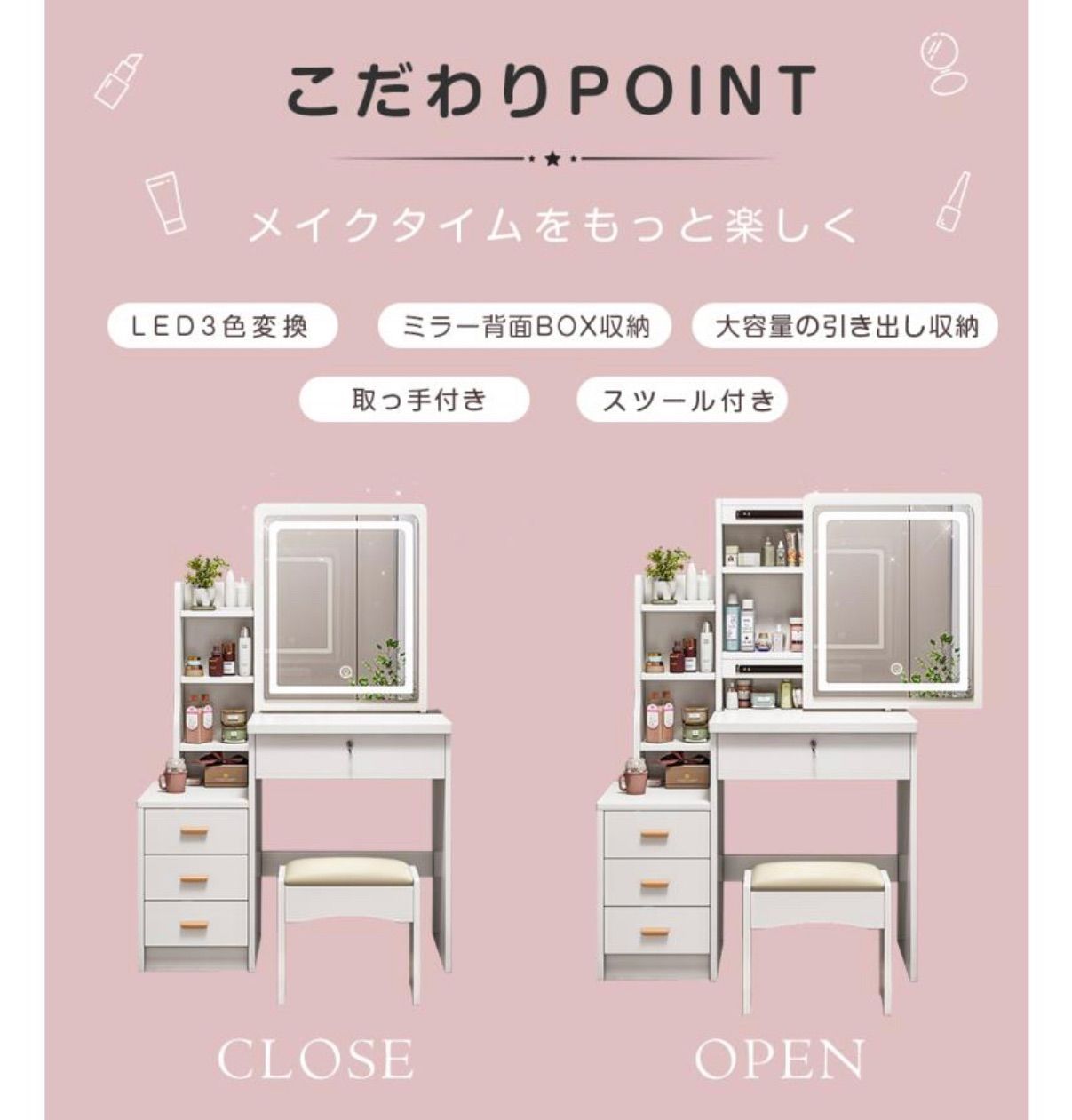 - リビング収納 > ドレッサー・鏡台 > 新品ドレッサー 北欧風 ライディングミラー LED三色変更 スツール付き 鏡台 限定セール』新品ドレッサー 北欧風 ドレッサー 鏡台 女優ミラー