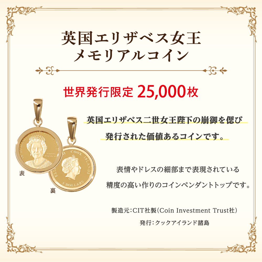 エリザベス女王 銅貨 金メッキ付き 追悼 クイーン メモリアル 英国 ブリタニア K18 / K24 クイーンエリザベスメモリアル コインペンダント