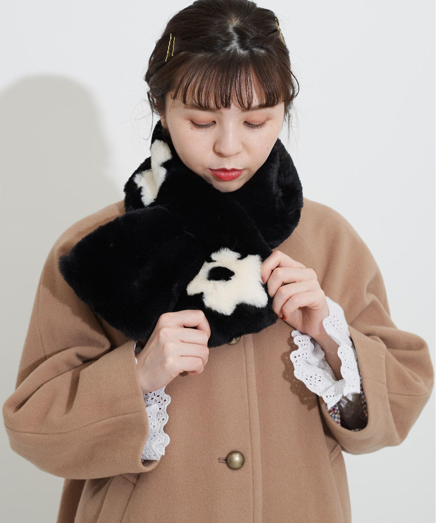 | メーカー | child woman フェイクファーはめ込み花モチーフ マフラー ネイビー |